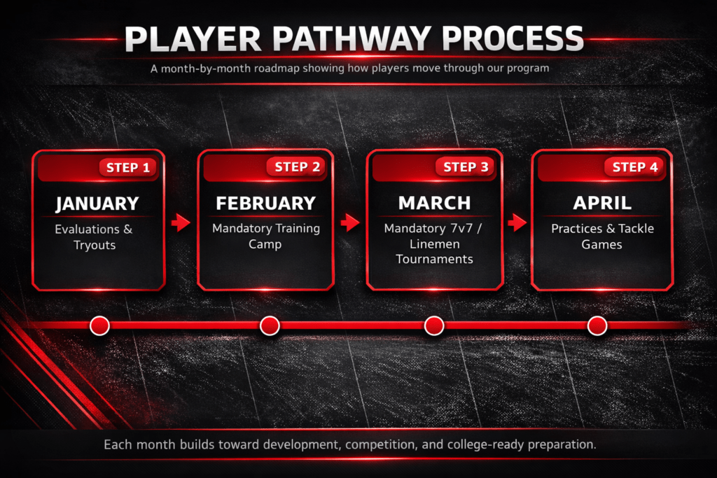 Players leave this process with elite development, better film, real competition experience, and increased exposure to college coaches. Every phase is built to help athletes grow their skill set, raise their football IQ, and put themselves in position to earn recruiting attention and scholarship opportunities.